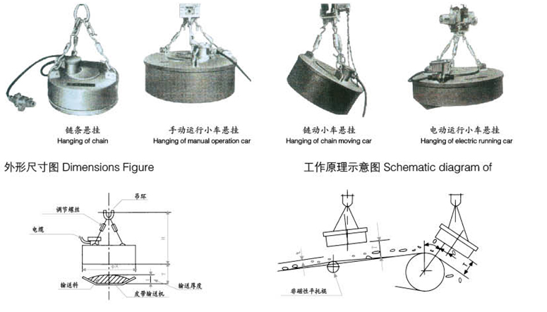 本系列產(chǎn)品是為從磁性礦石中除去有害鐵件而專門設(shè)計的。其工作制為TD=100%.使用時懸掛在皮帶輸送機(jī)上,并需配以電動小車,金屬探測器,PC程控整流控制設(shè)備。經(jīng)吸引、分選、除鐵、回收等程序?qū)崿F(xiàn)自動,并安全地從輸送的磁性礦石中除去有害鐵件,同時將被吸的礦石自動送回皮帶輸送機(jī)上得到回收。