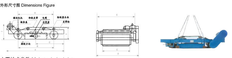 | 產(chǎn)品型號 | 對應行標型號 | 標準架設高度(mm) | 輸送皮帶寬度 (mm) | 額定電壓(V) | 冷態(tài)消耗功率(KW) | 自重(kg) | 外形尺寸(mm) | 卸扣 | 驅動電機容量 | 配套電控(單臺除鐵器用) | ||||||||